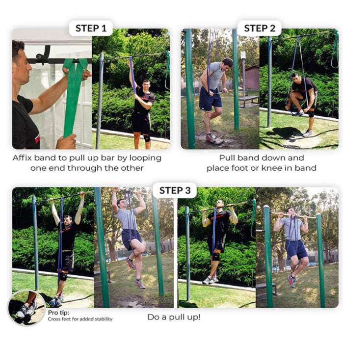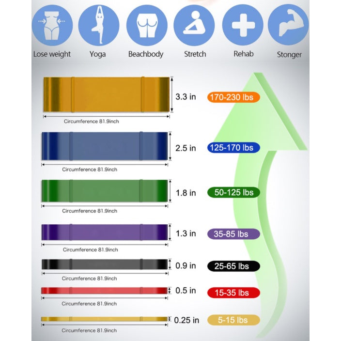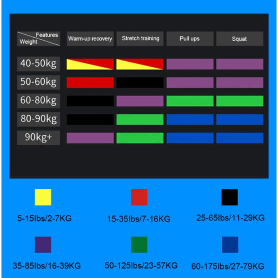 Resistance Range: Yellow 5-15LBS, Red 15-35LBS, Black 25-65LBS, Purple 35-85LBS, Green 50-125LBS,Blue 125-170LBS,Orange 170-230LBS