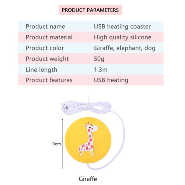 1* This cup pad Round diameter is 9cm,The actual working part is 3.5cm x 3cm, The temperature of the heated portion of the surface of the coaster is maintained about 50-80 degrees when it working (except the thermometer, no other things are placed on the cup pad , then get this measurement results).