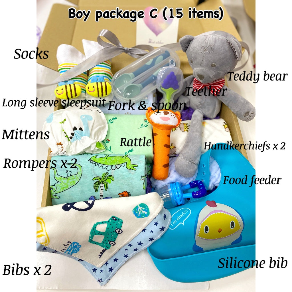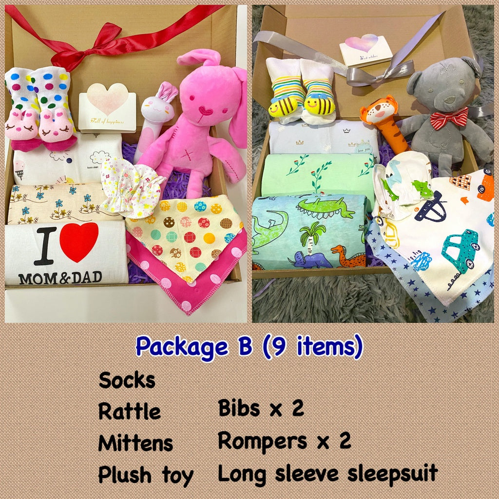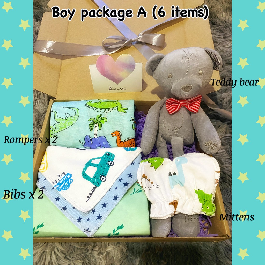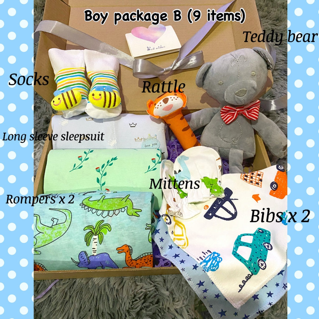 3.Please note the photos are for illustration only to show you the product type and quantities of each package. All the rompers, socks, bibs, handkerchief, rattle and teether will be given random design based on the gender. So if you pick boy package we will give out colours like blue, green, grey, etc.