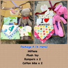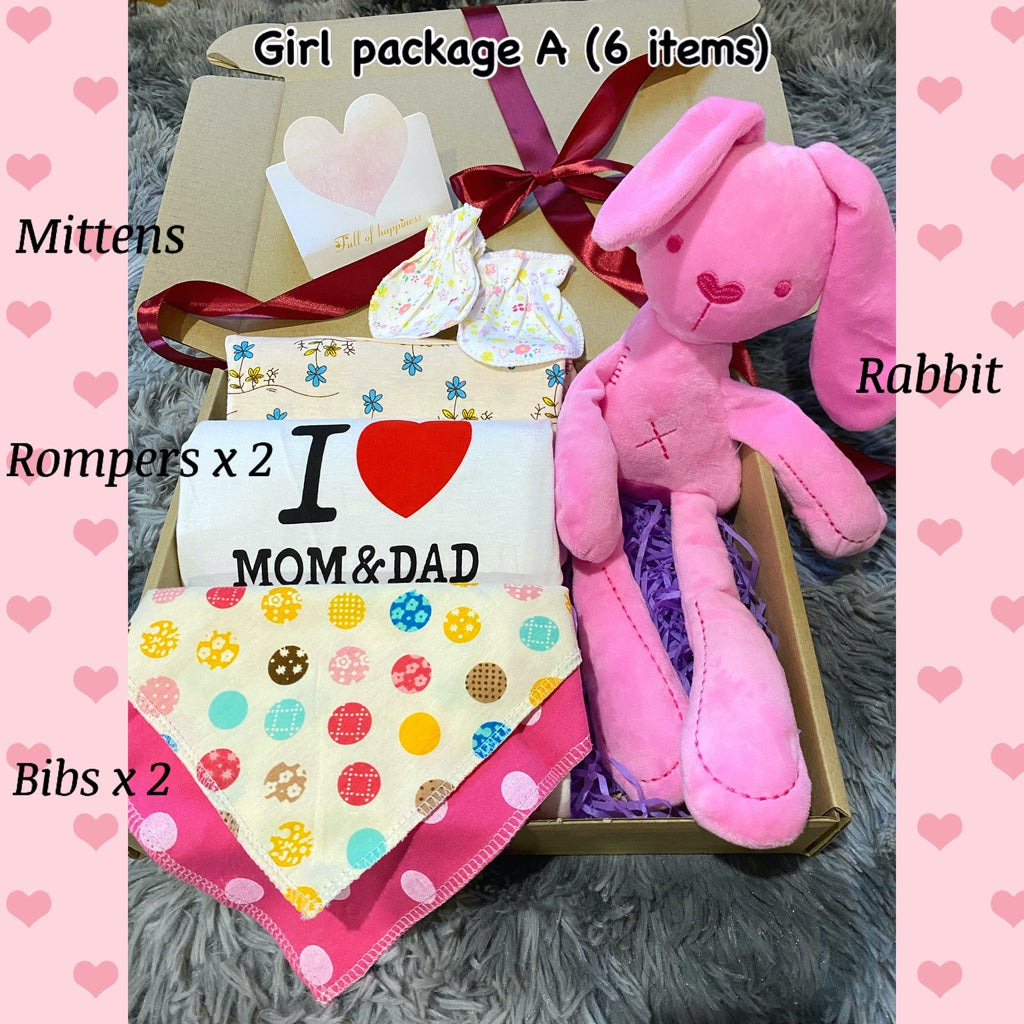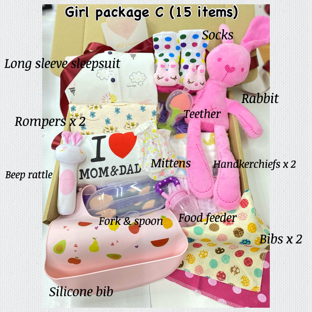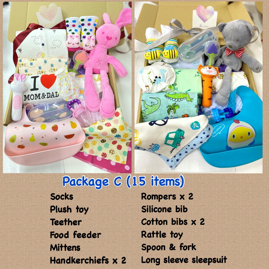 3.Please note the photos are for illustration only to show you the product type and quantities of each package. All the rompers, socks, bibs, handkerchief, rattle and teether will be given random design based on the gender. So if you pick boy package we will give out colours like blue, green, grey, etc.