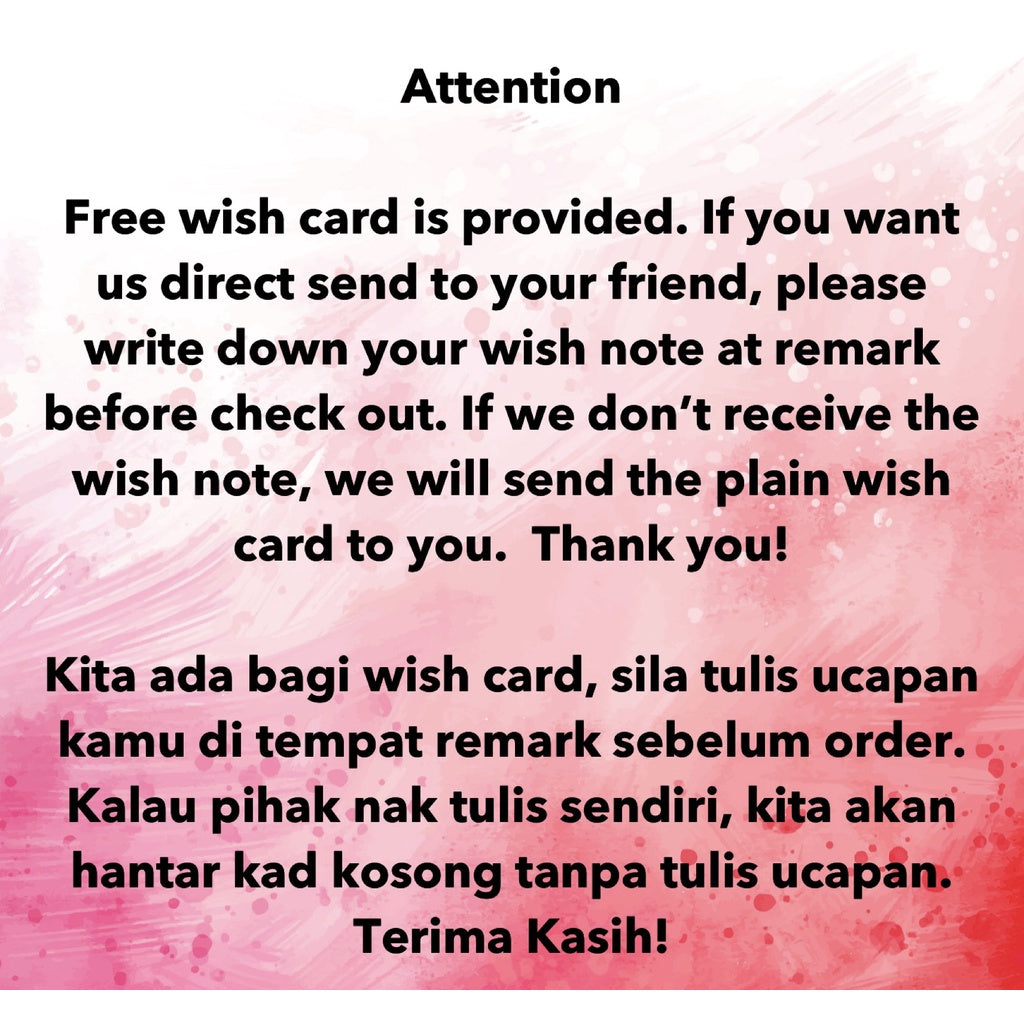 2.you can post to your friend’s address directly as we provide free wish card and ribbon wrapped packaging, just put your wish note at the remark before check out, we will hand write your wish note on the card. If we don’t receive the wish note from you, we will just send the empty wish card to you (put outside the gift box).