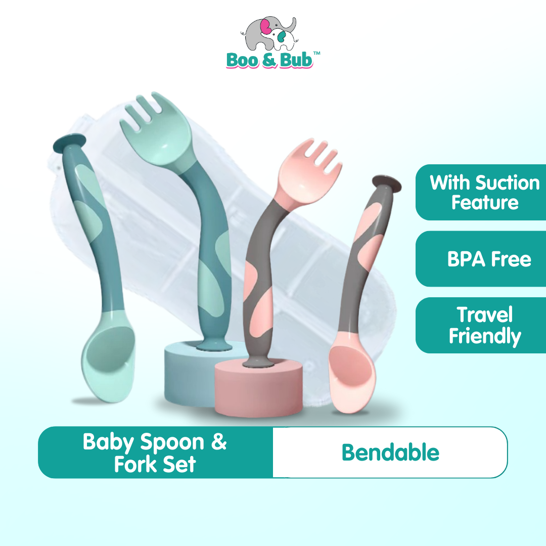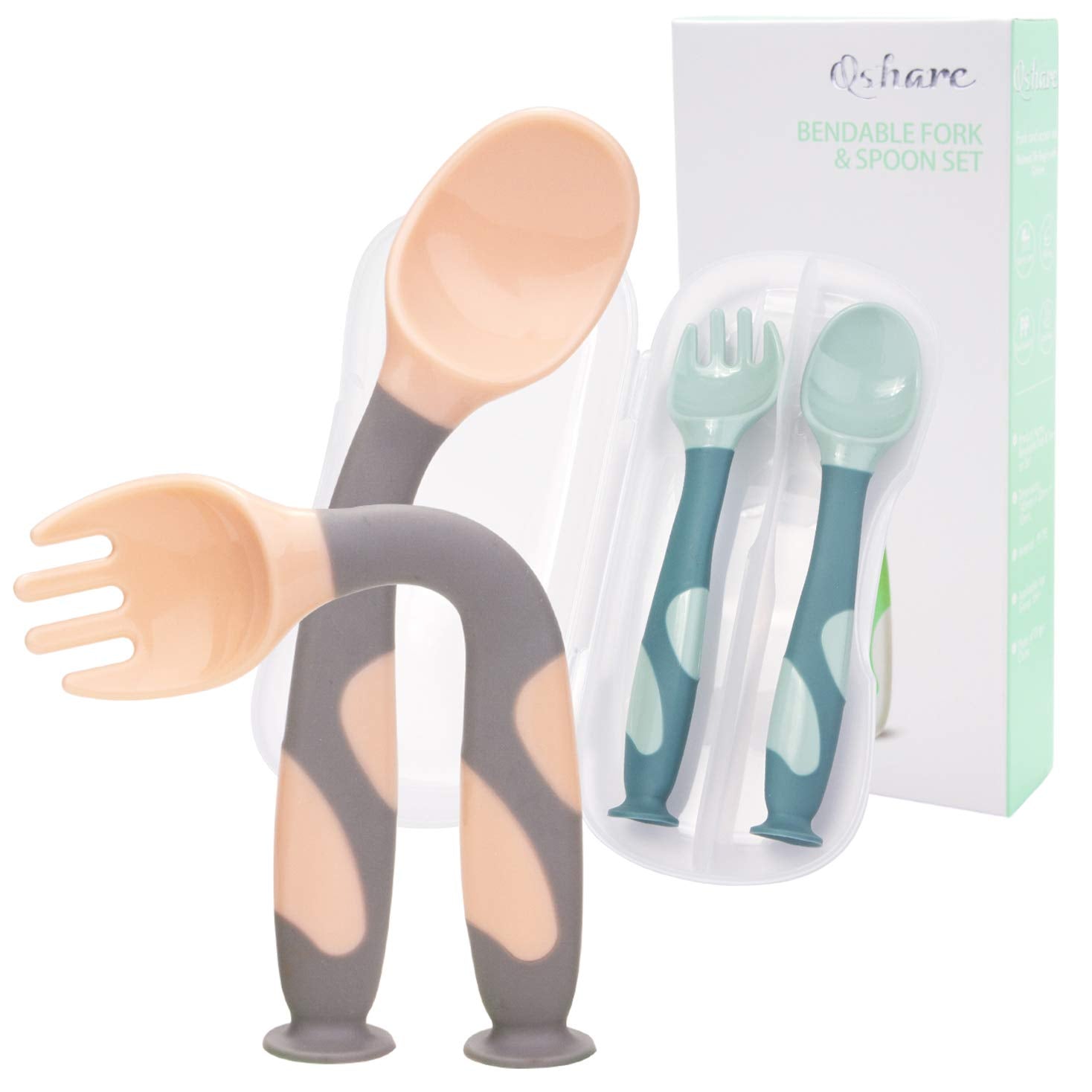 Flexible Baby spoon and fork set with travel case | Easy to hold utensils for toddler kid feeding dining set