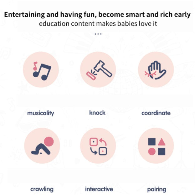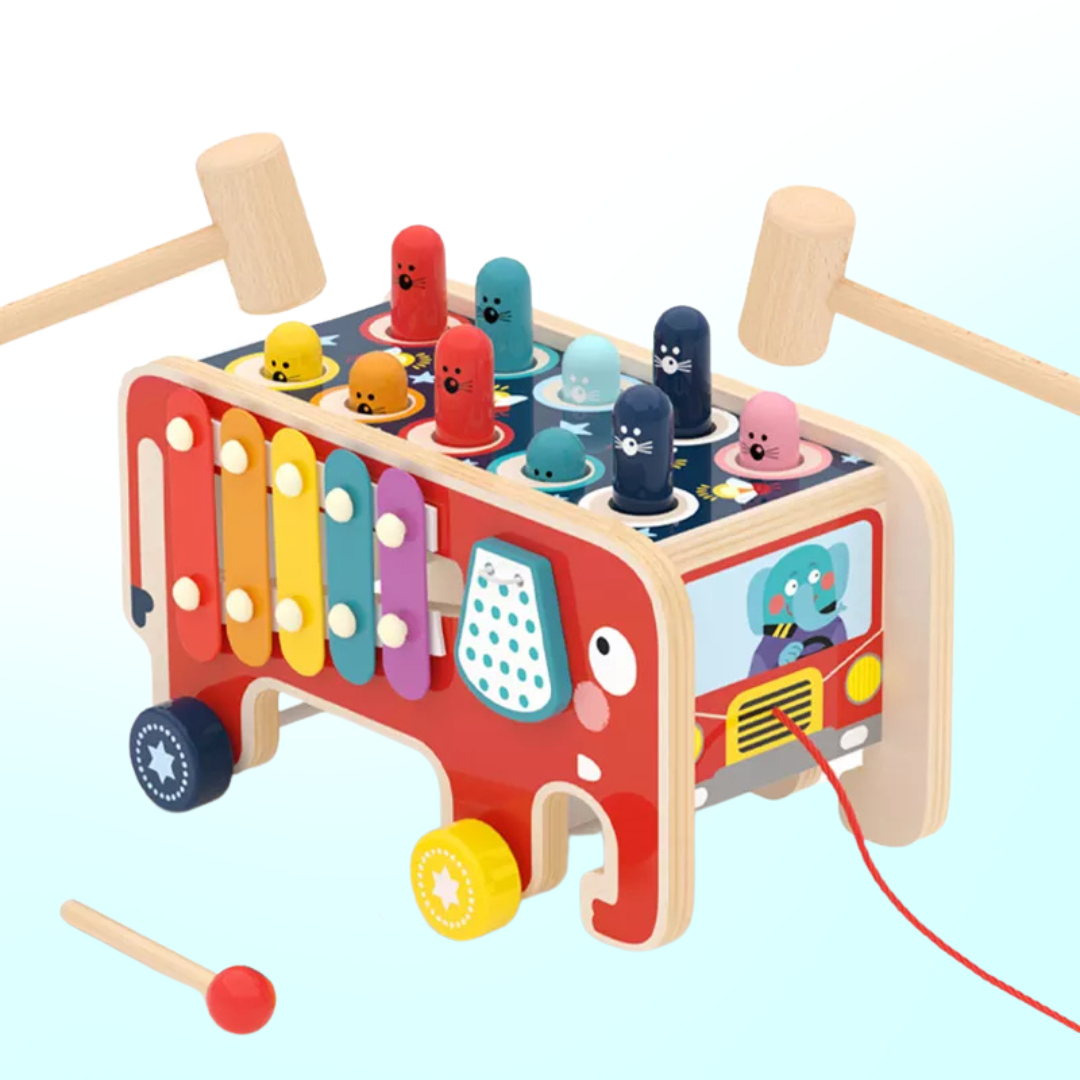 - There is a 7-key color piano on the bus, which contains 7 tones. Different keys will produce different tones, which can cultivate the babys music perception ability. There is also a storage space for the knocking stick at the bottom of the vehicle body, so that the knocking stick is not easy to lose.