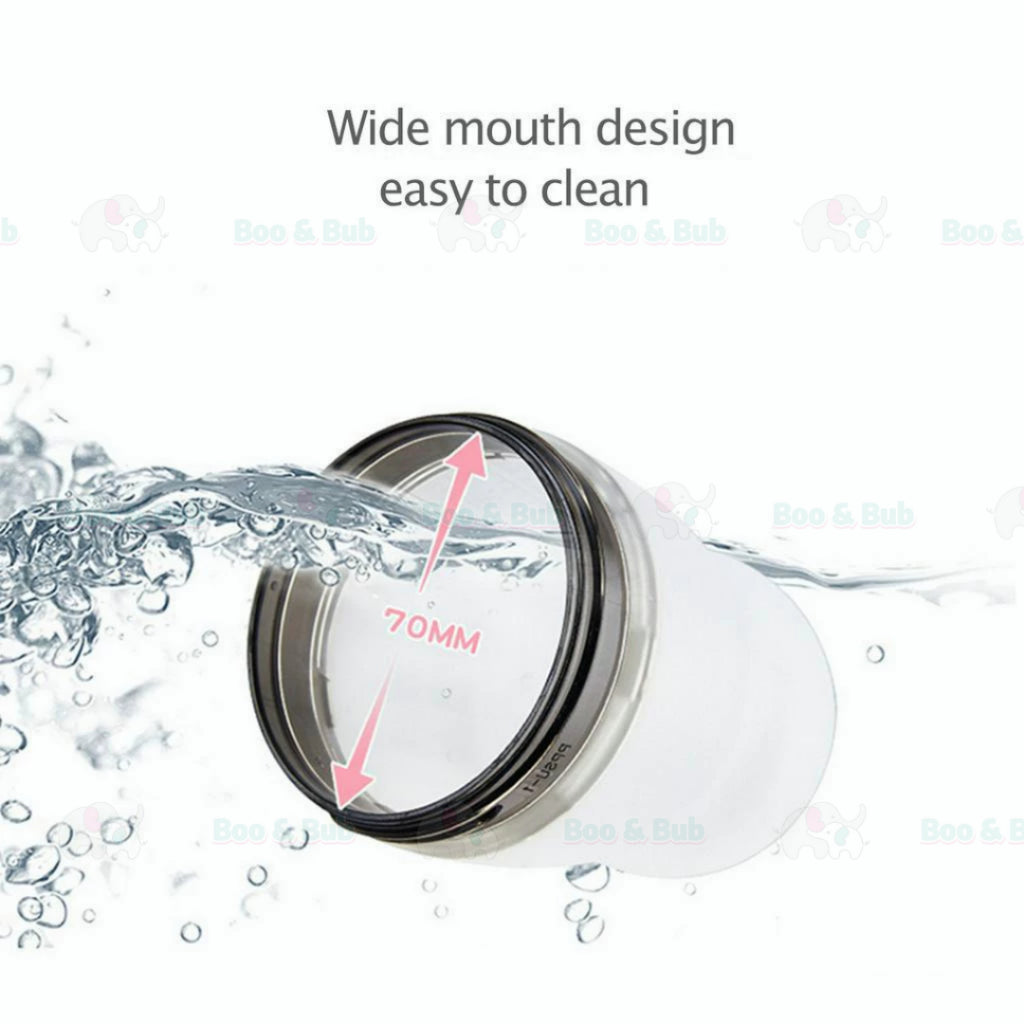 -Ultra wide-neck design allows easy cleaning by hand without a brush.