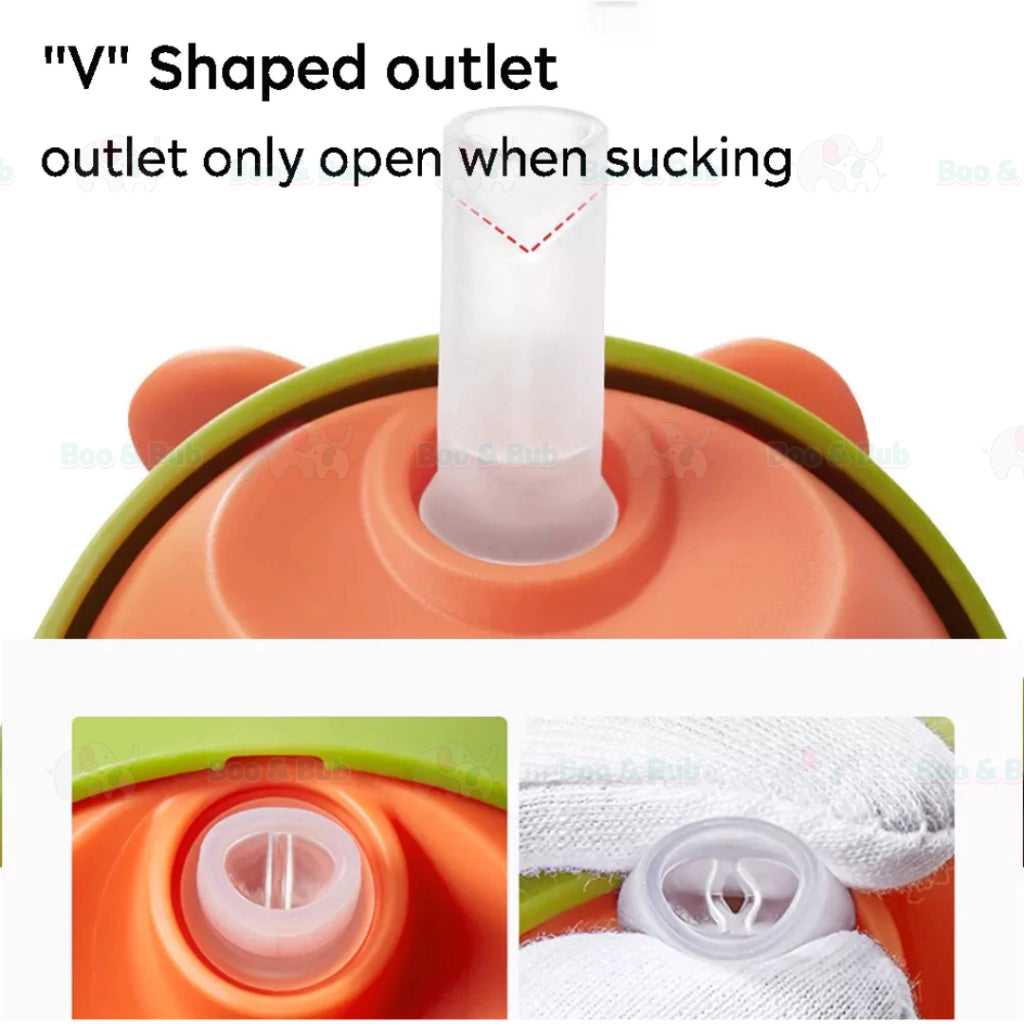 - Silicone Straw with V shaped opening that will only let water out once the baby bites the straw.